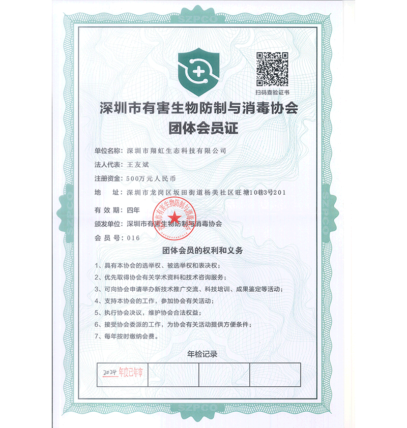 深圳市翔虹生態(tài)科技有限公司成立于1995年,是深圳最早成立的專業(yè)蟲害防治公司之一。公司發(fā)展至今獲得全國有害生物防制服務(wù)A級資質(zhì)、廣東省有害生物防制服務(wù)A級資質(zhì)、深圳市有害生物防制服務(wù)A級資質(zhì)、廣東省有害生物防制服務(wù)A級資質(zhì)、深圳市有害生物防制服務(wù)甲級資質(zhì)的單位,是中國有害生物防治協(xié)會會員、廣東省有害生物防治協(xié)會會員、深圳市有害生物防治協(xié)會理事單位,多次獲得“深圳市十佳消殺單位”榮譽。